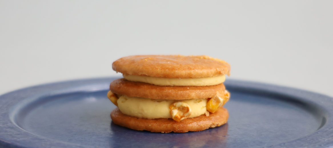 This treat features corn powder made from corn grown in Biei, and chunks of roasted corn from Biei as an accent. The sable cookie is sprinkled with Hokkaido-grown corn grits for a delightful sweet and salty flavor.