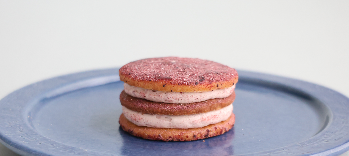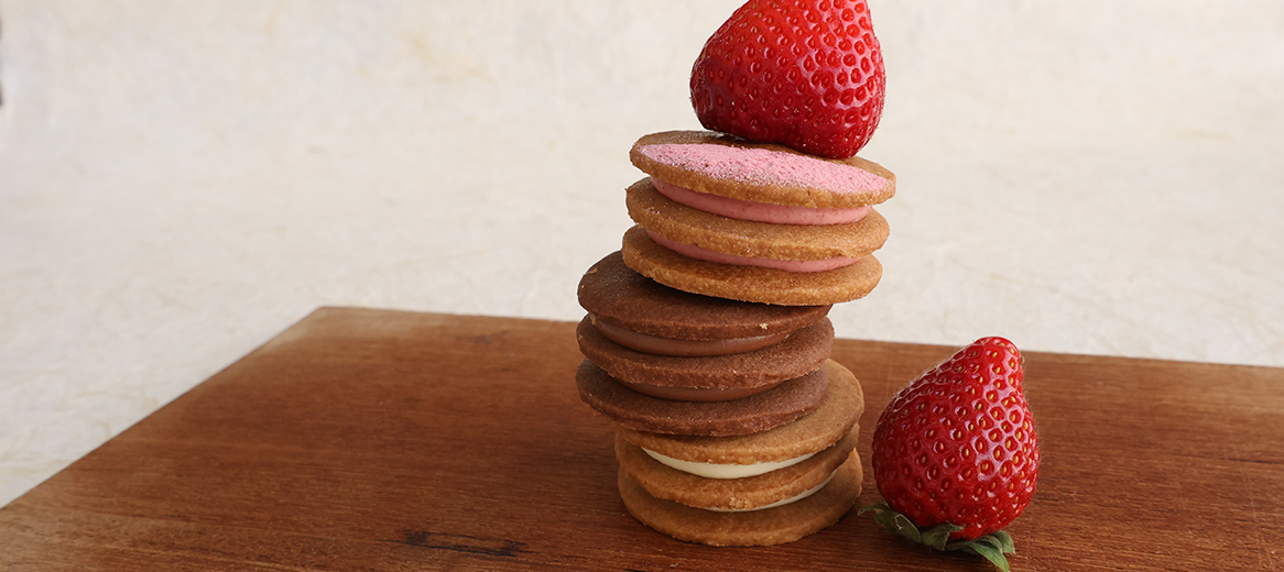 A sweet and tart Amaou strawberry cream is sandwiched between crispy shortbread cookies. The deliciousness of the sweet and tart cream really shines through. Finished off with a dusting of Amaou strawberry-scented powder!
