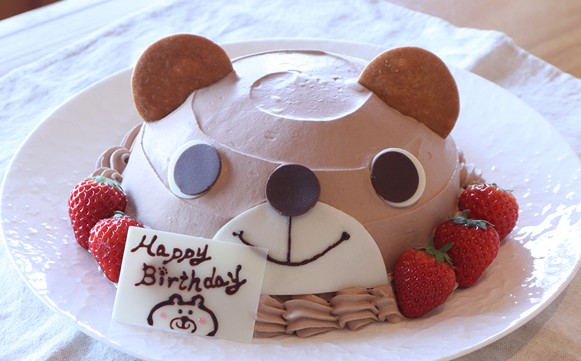 美瑛小麦を使った味わい深いスポンジ生地に、純生クリームと北海道産いちごをサンドしています。周りにはチョコレートクリームでデコレーションしました。クマさんのお顔をモチーフにしたケーキです。